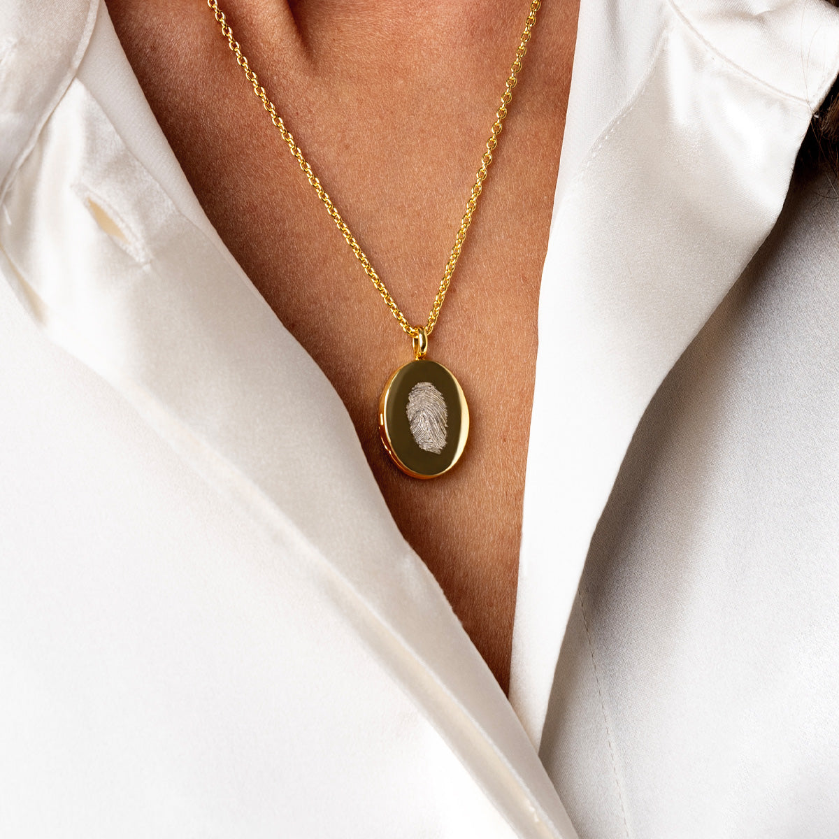 Capture the unique touch of someone you love with this stunning oval gold fingerprint locket necklace. Each locket is engraved from your fingerprint, preserving every swirl and line with crisp, lifelike detail.