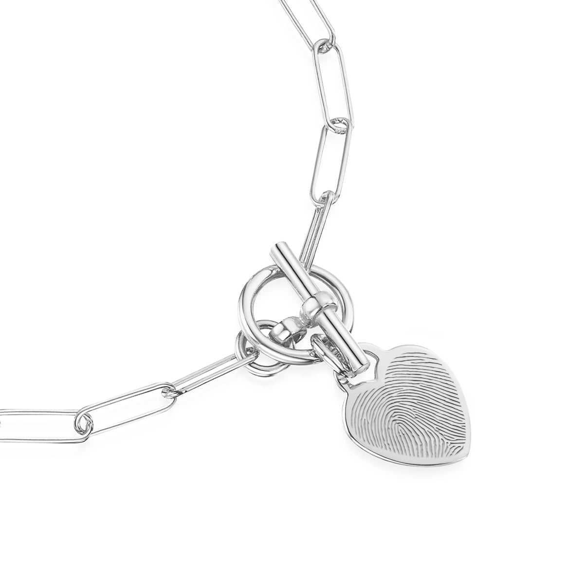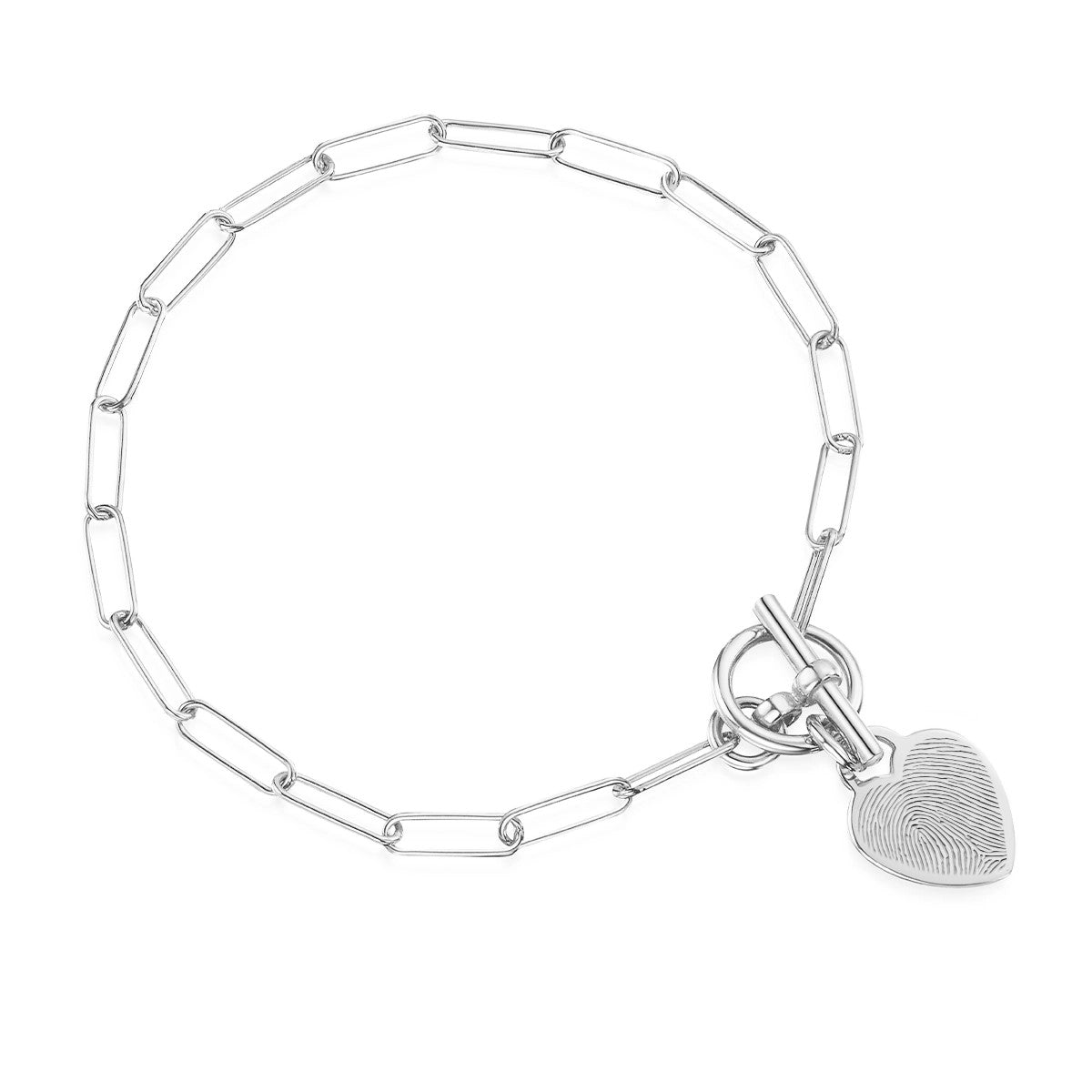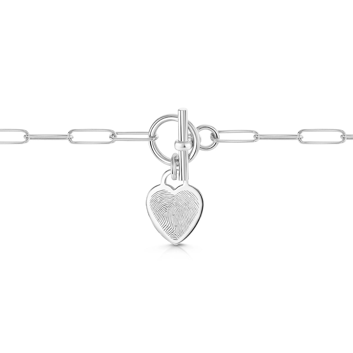 Capture the unique touch of someone you love with this T-Bar heart paper-clip chain bracelet designed for everyday wear. Each pendant is engraved from a real fingerprint, preserving every swirl and line with crisp, lifelike detail.