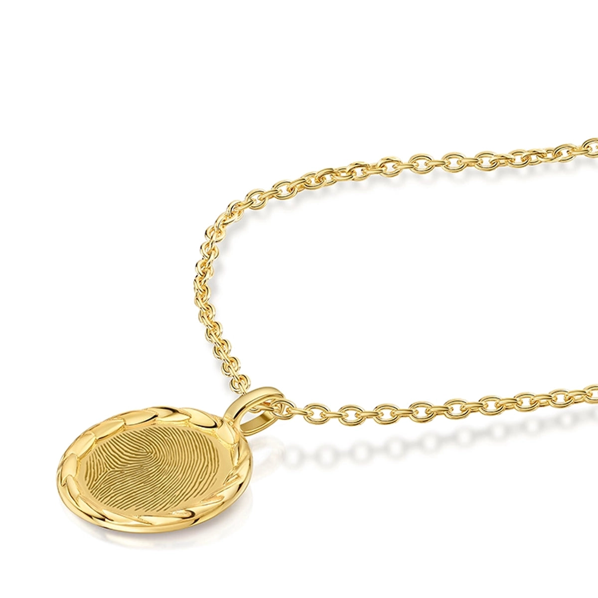 Capture the unique touch of someone you love in round rope-framed fingerprint necklace designed for everyday wear. Each pendant is engraved from a real fingerprint, preserving every swirl and line with crisp, lifelike detail.