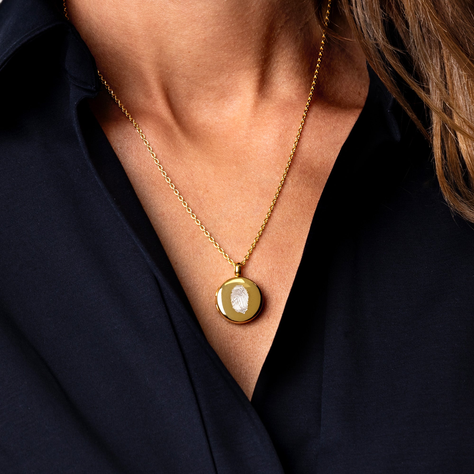 Capture the unique touch of someone you love with this stunning round gold fingerprint locket necklace. Each locket is engraved from your fingerprint, preserving every swirl and line with crisp, lifelike detail.