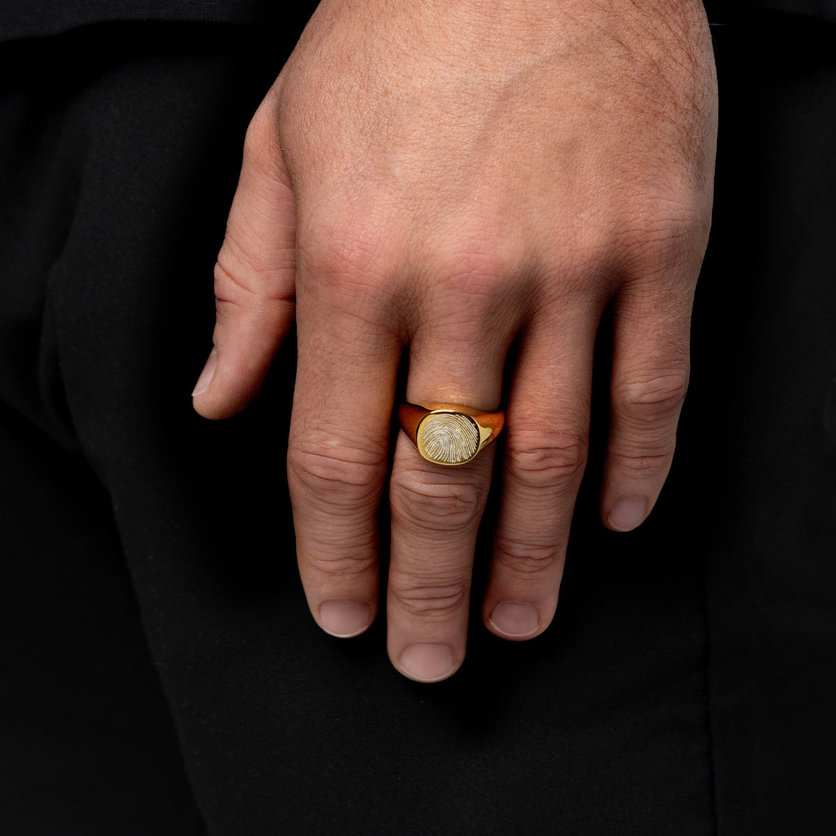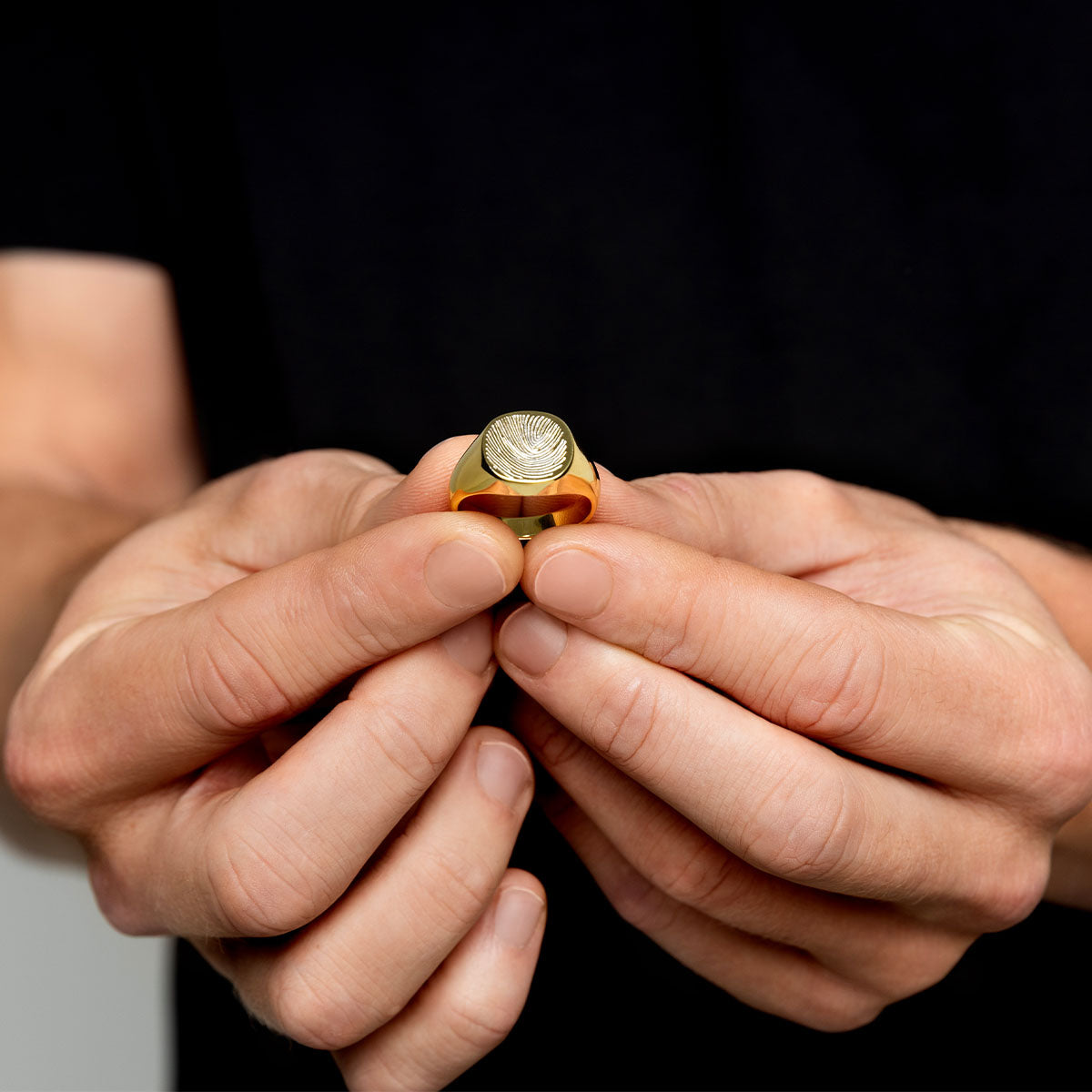 Capture the unique touch of someone you love with this cushion fingerprint signet ring. Each piece is engraved from your real fingerprint, preserving every line and swirl with crisp, lifelike detail.