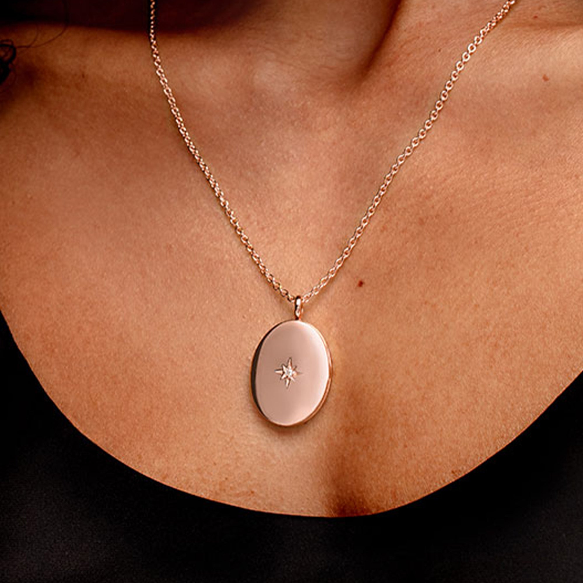 Large 18K rose gold plated sterling silver oval locket with clear crystal inset within a star design. This classic oval pendant features clean, contemporary lines and a carefully constructed hinge integrated into the design. A clasp is provided for balance, and expert engraving plus the inclusion of two photos make this gift extra special.