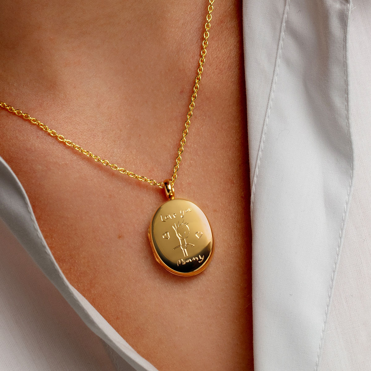 Designed for Mummies all over the world, this gold locket is intended to be an everlasting and touching keepsake from her children. A child’s drawing adorns the front of the locket, with the words “Love You Mummy” in handwriting above and below, and two hearts to finish the design.