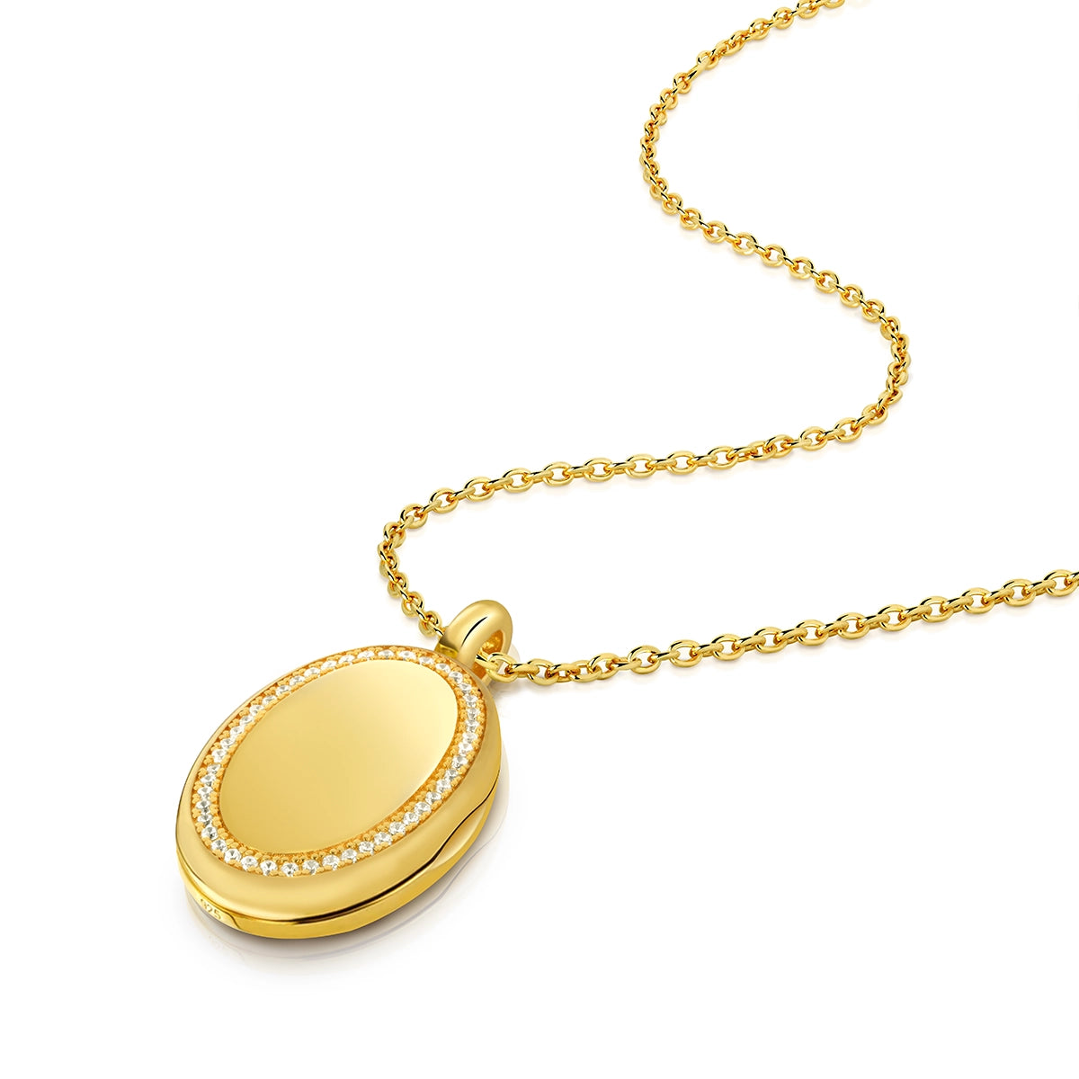This oval locket pairs a timeless shape with a fine crystal border for added detail. Made from 925 sterling silver and plated in 18k gold, the smooth reverse offers space for engraving, while the inside holds two photo compartments.