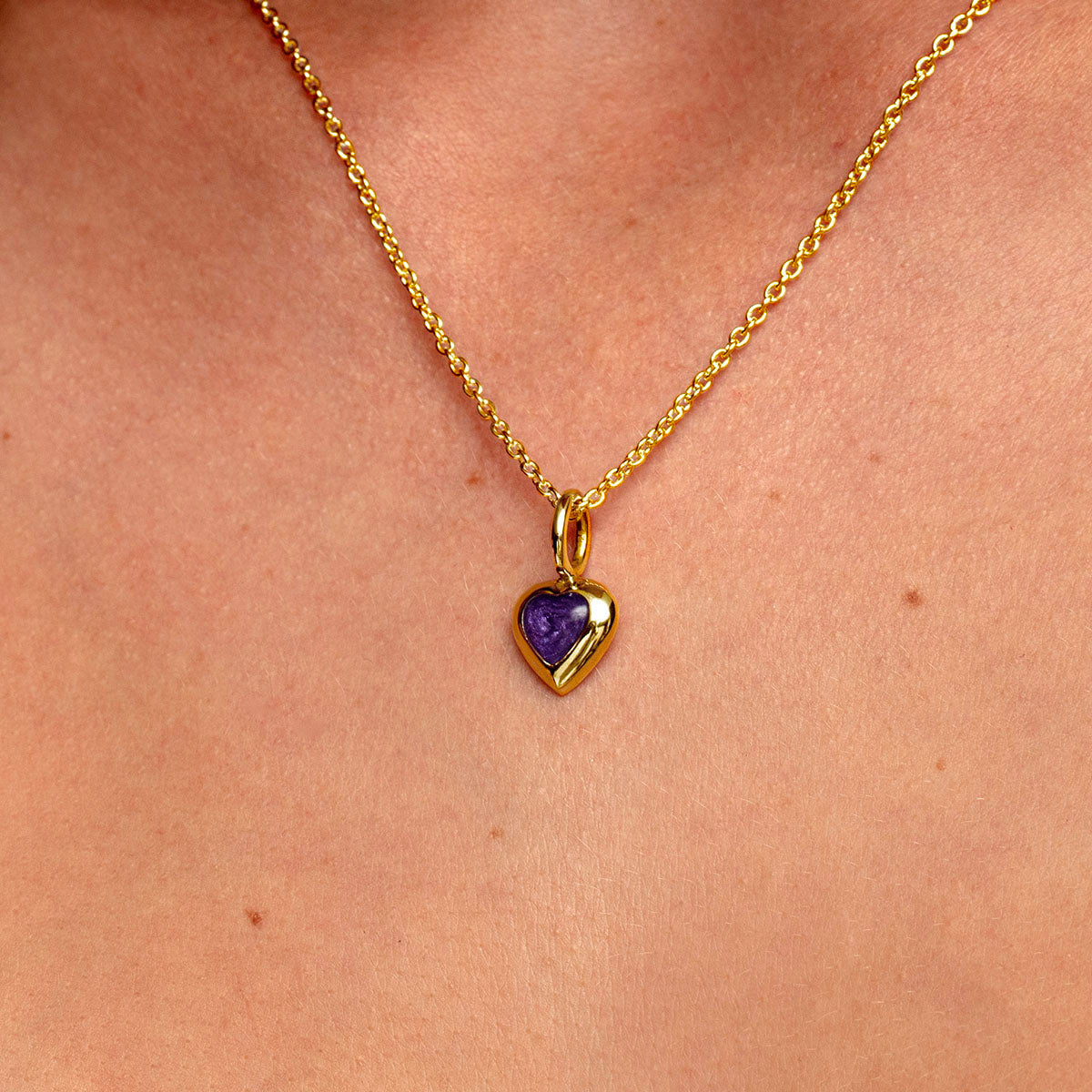 Crafted from 925 sterling silver plated with 18K gold this delicate piece features a heart shaped pendant with a signature loop bail.