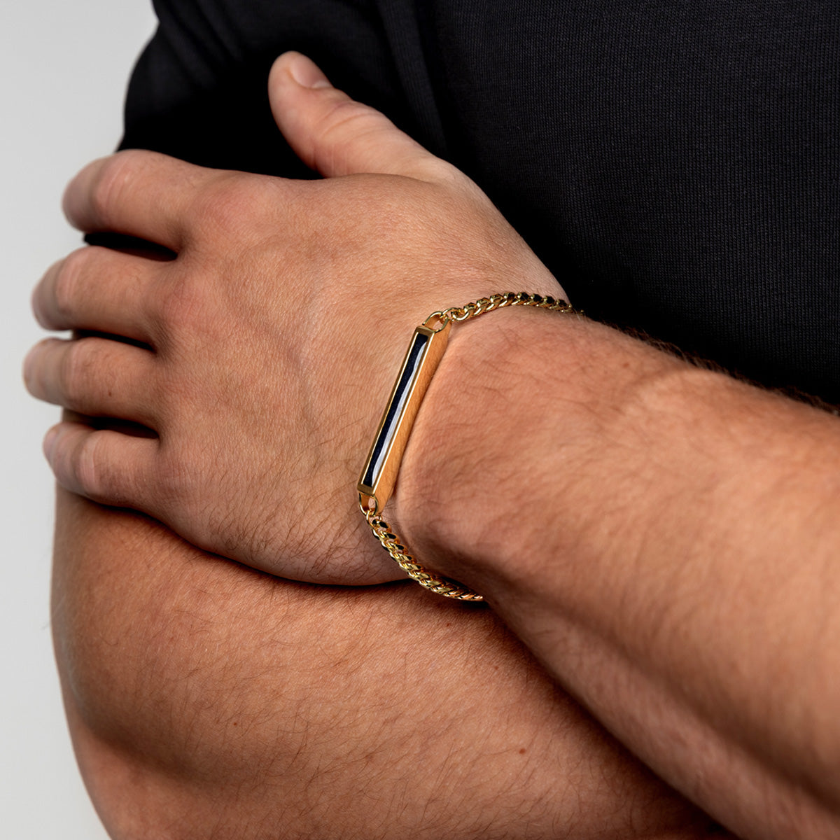 Combining strong design with personal meaning, this men’s cremation ashes bracelet features a large rectangular capsule crafted from 925 sterling silver and plated in 18K gold. The centre holds a hand-mixed resin inlay, designed to incorporate a small portion of cremation ashes to create a unique celestial finish.