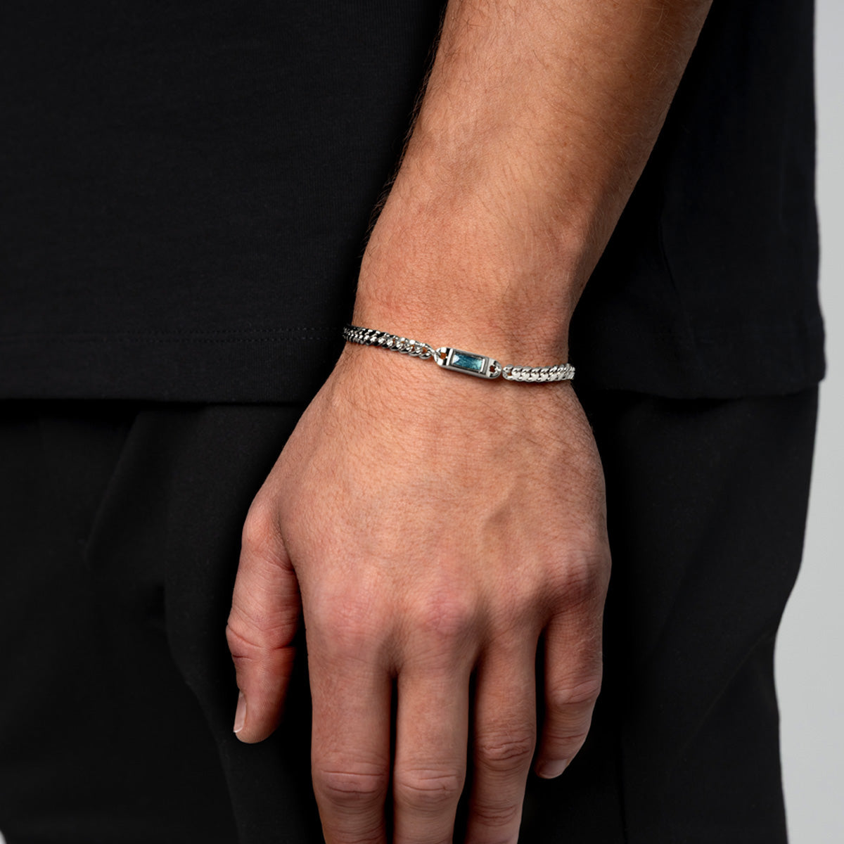 The bottom surface of the capsule can be diamond-cut engraved with an initial, adding a simple yet personal touch to the piece. Paired with a polished Cuban chain, the bracelet offers a balance of meaning and everyday wearability.