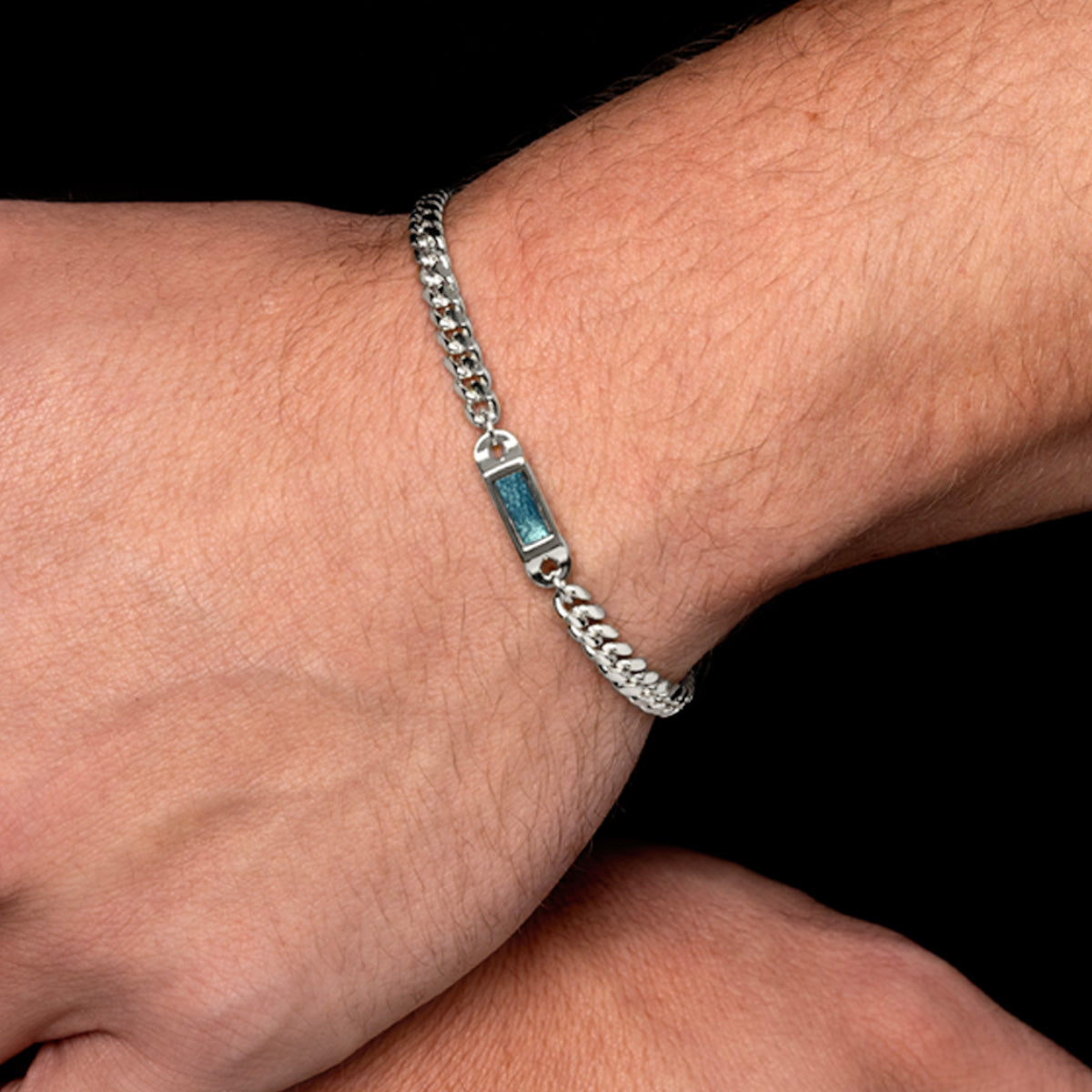 Crafted from solid 925 sterling silver, this cremation ashes bracelet holds a symbolic tribute within a compact capsule design. The central inlay is created from a specialist resin, blended with a small portion of cremation ashes and coloured pigment to form a unique, celestial- appearance.