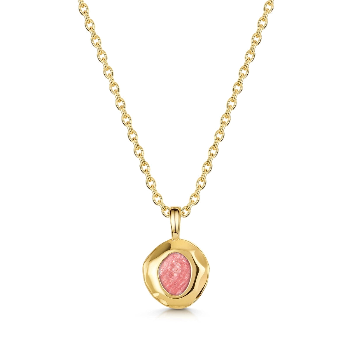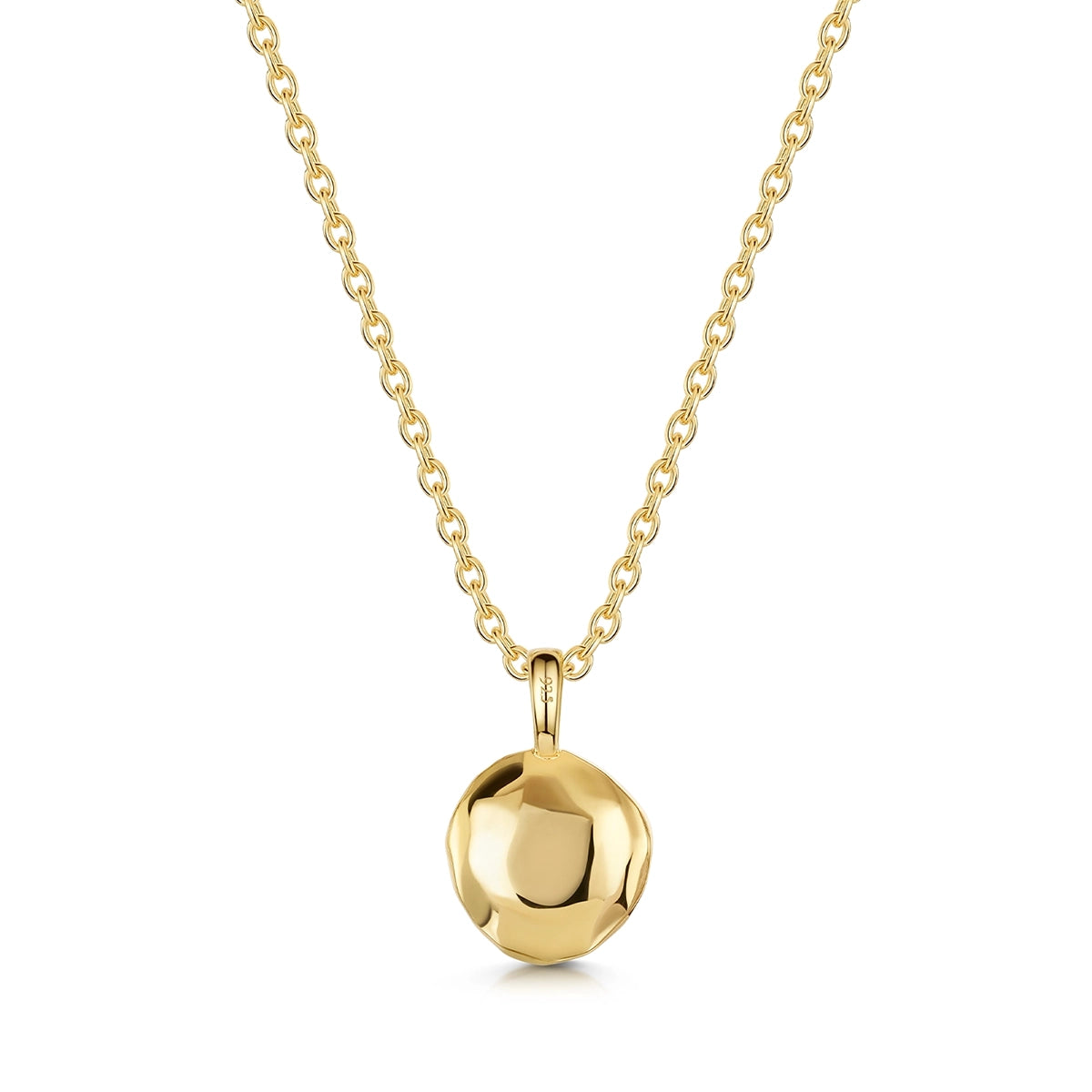 Crafted from 925 sterling silver and plated in 18k gold, this necklace features a softly contoured round pendant with an organic, fluid, pebble-like shape.