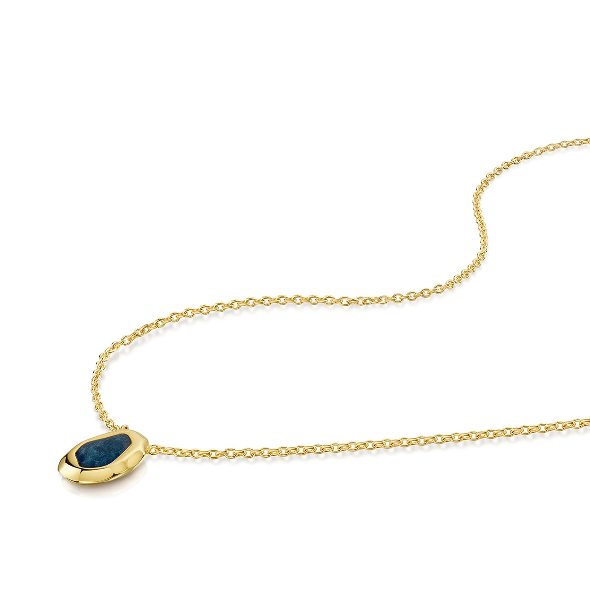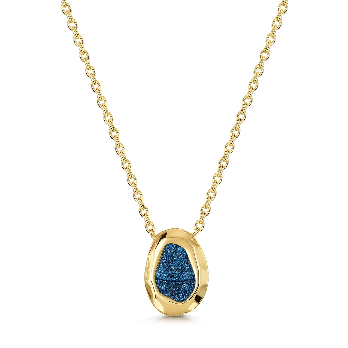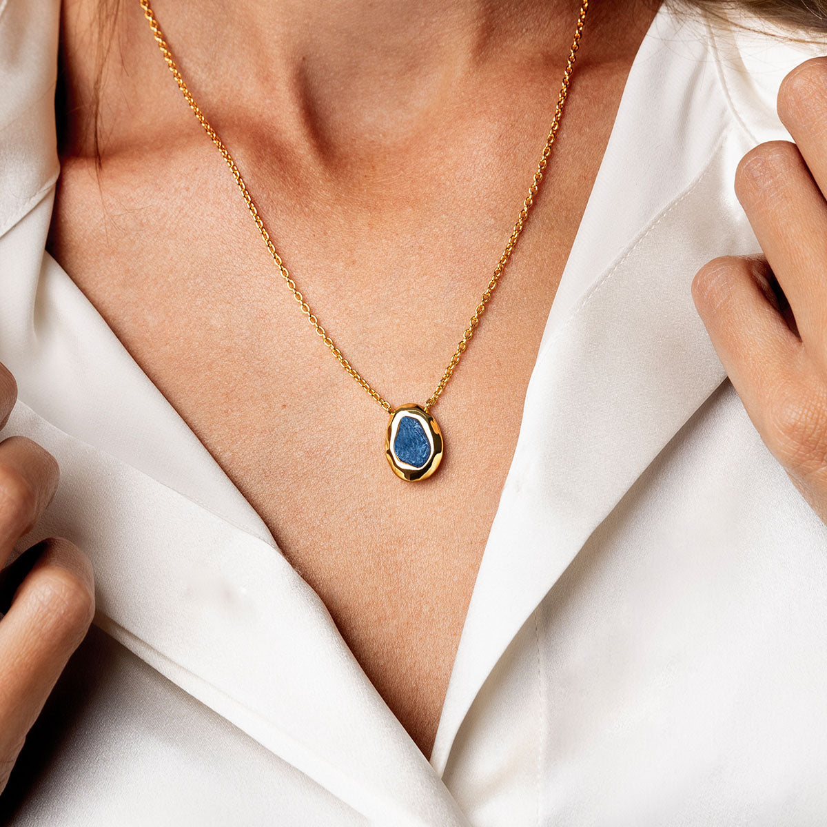 Crafted in 925 sterling silver with 18k gold plating, this memorial necklace features a naturally contoured pendant inspired by the organic shape of river-worn stones.