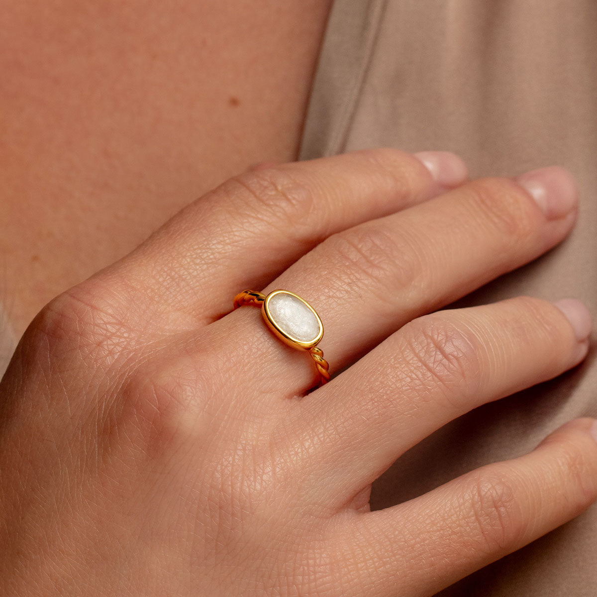 Crafted from 925 sterling silver plated with 18K gold this timeless ring features an oval centrepiece with a twisted band.