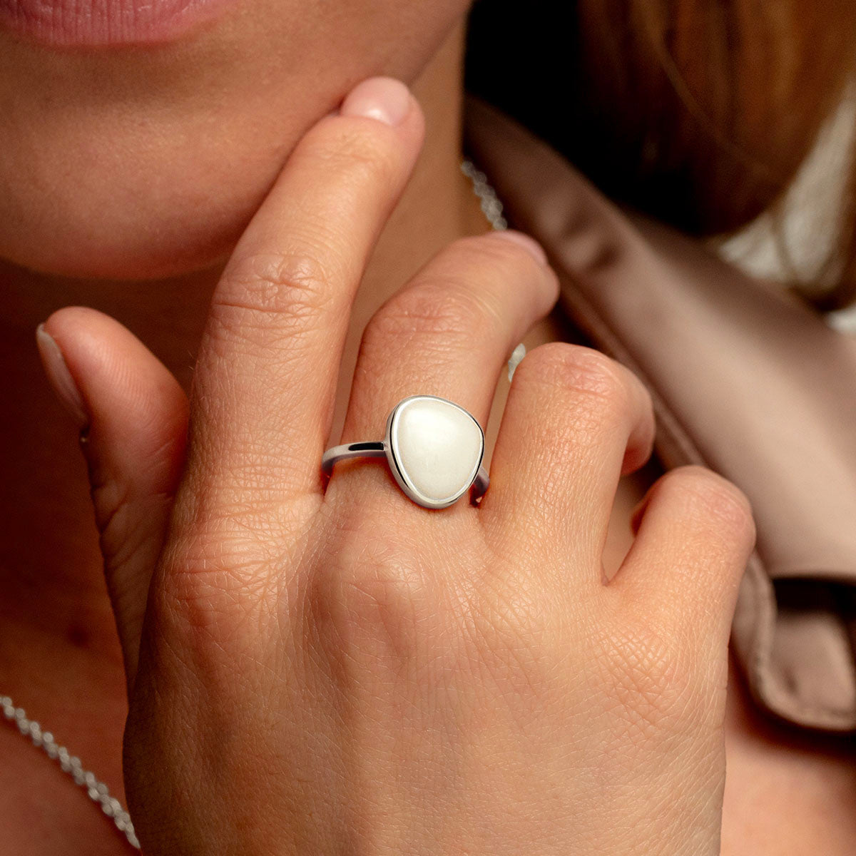 Crafted from 925 sterling silver this contemporary ring features an organic pebble shaped centrepiece with a plain band.