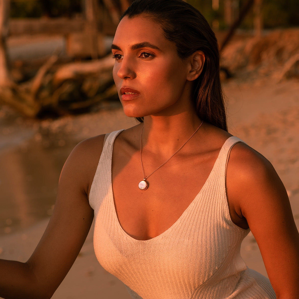 Mother of Pearl inlaid into 925 sterling silver round locket with 18K rose gold plate. The clean lines and flat edges of this locket appeal to contemporary sensibilities, with the minimalist styling beautifully showcasing the iridescence of the stone.