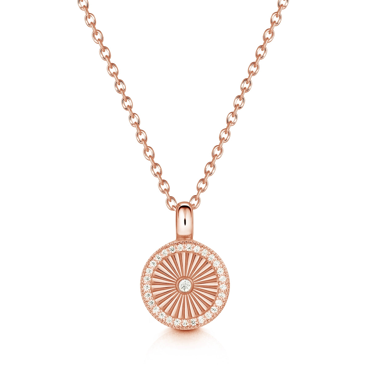 This round urn necklace combines a radiant design with a deeply personal purpose. Crafted from 925 sterling silver and plated in 18k rose gold, the pendant features a sunburst pattern set with a central crystal, framed by a shimmering halo of stones.