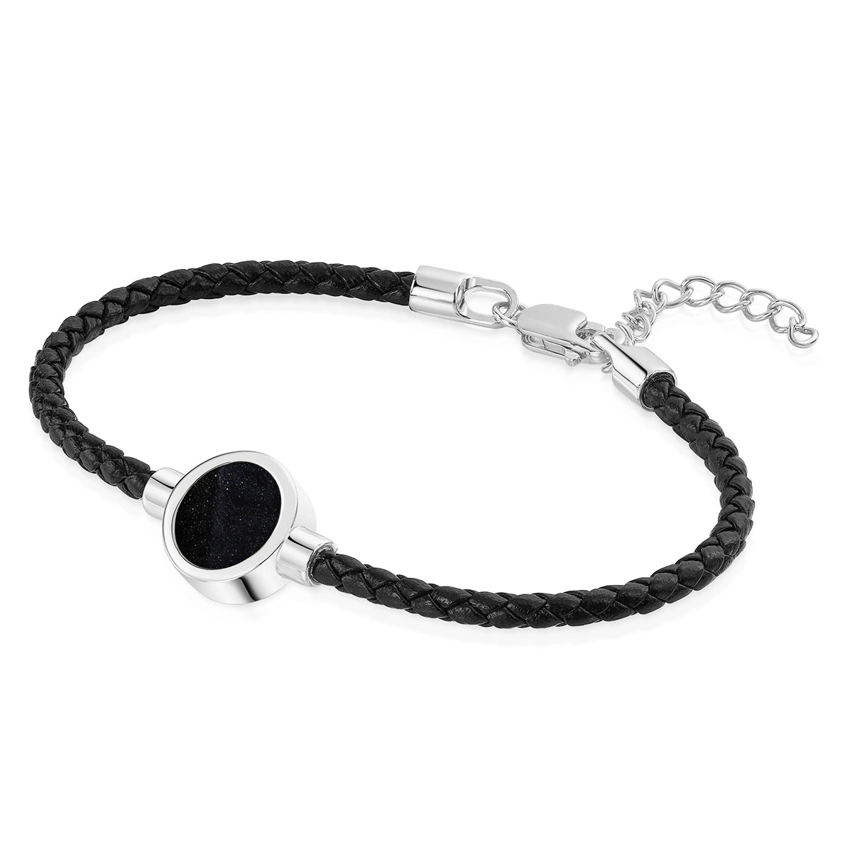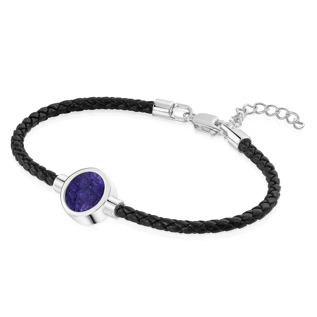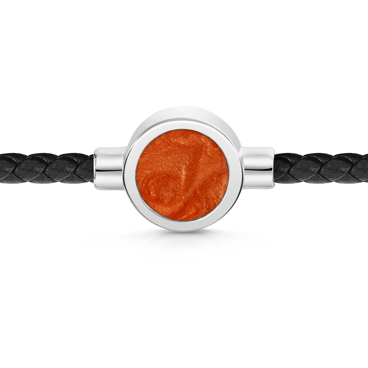 This memorial bracelet is crafted from solid 925 sterling silver and features a resin centrepiece designed to hold cremation ashes. The round capsule sits between two braided leather cords for a clean, contemporary finish.