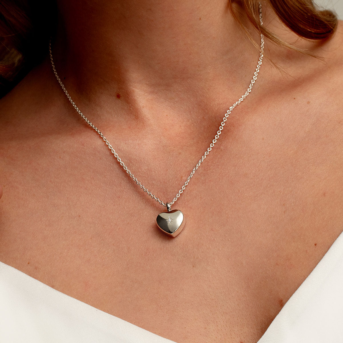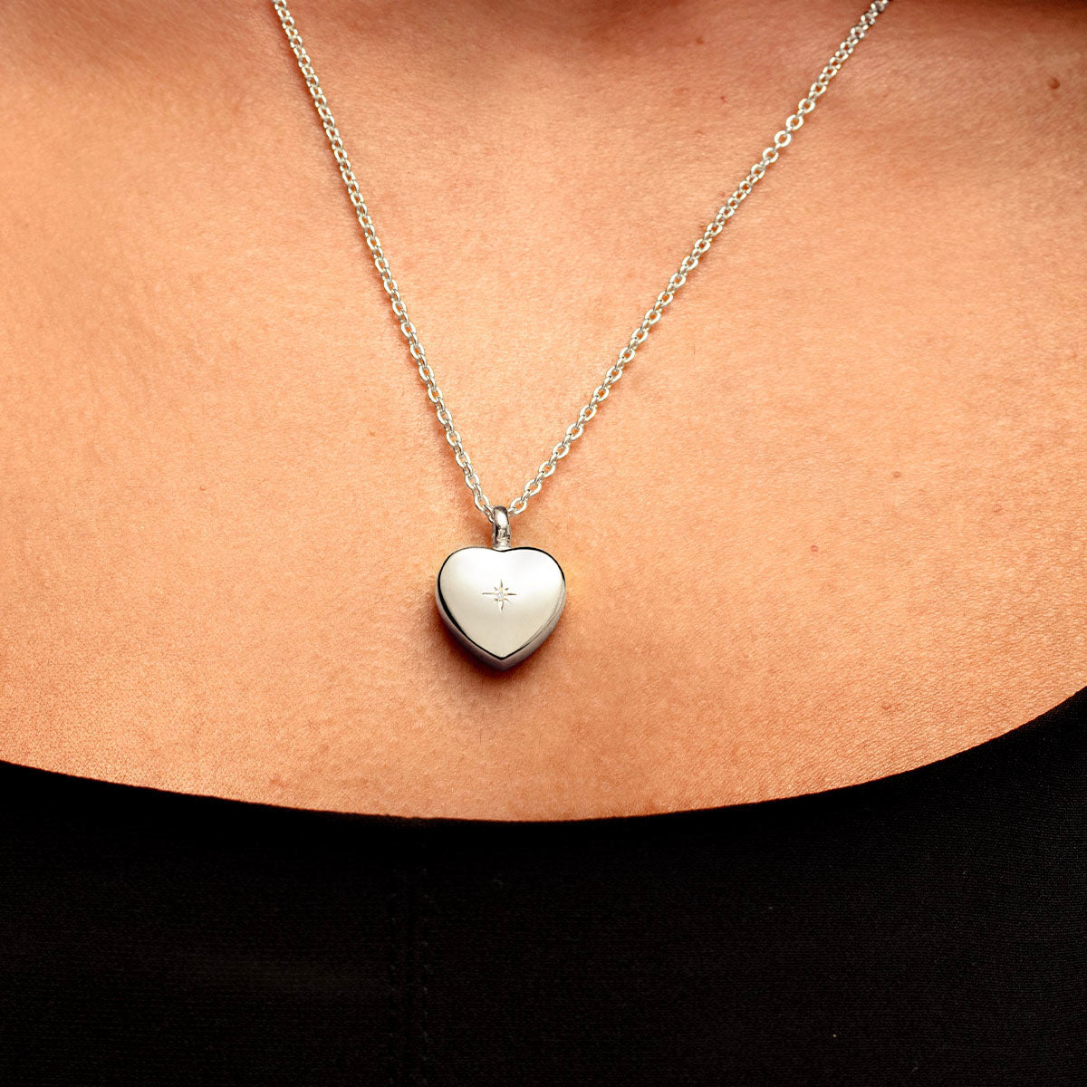 Celebrate love and memory with the Large Crystal Set Heart Urn Necklace. Crafted from solid 925 sterling silver this stunning heart-shaped urn features a clear crystal set in a delicate starburst design and a high polish finish. The heart urn opens via a secure screw mechanism, offering a discreet compartment to hold a small portion of cremation ashes. This keepsake includes a funnel and pin set for easy decanting at home. For an added personal touch, the back of the pendant can be engraved with a short, heartfelt message.
