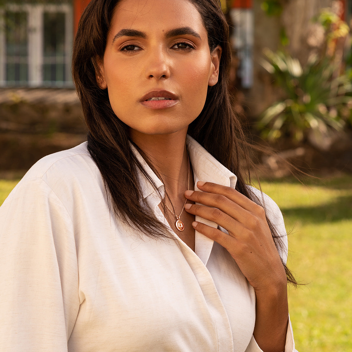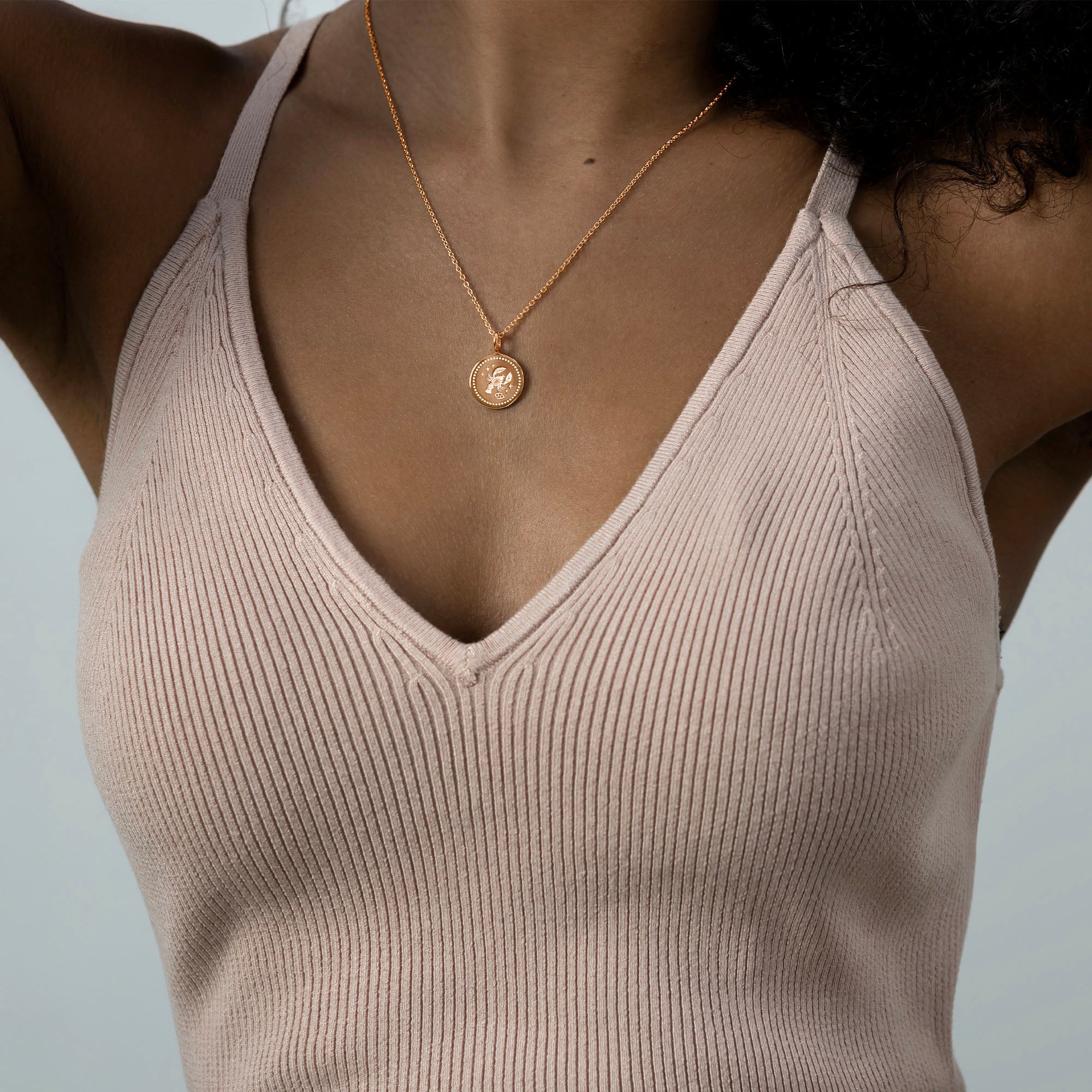 The pendant measures 15mm in diameter and is suspended from an adjustable 16–18 inch trace chain, with the option to upgrade to a longer 20-22-24 inch adjustable chain. The pendant and chain are crafted from 18k rose gold plated 925 sterling silver.