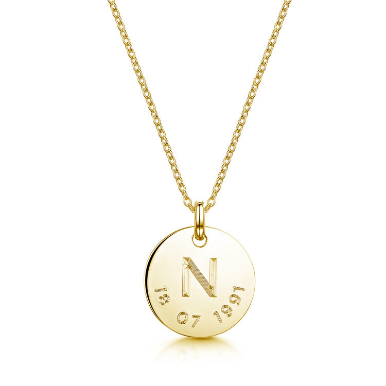 Crafted from 18k gold plated 925 sterling silver, the front of the pendant showcases a single initial at the centre, with space to engrave a date around the edge - perfect for marking a birthday, anniversary, or special milestone. The simple circular form keeps the focus on the personal engraving while maintaining a refined, everyday style.