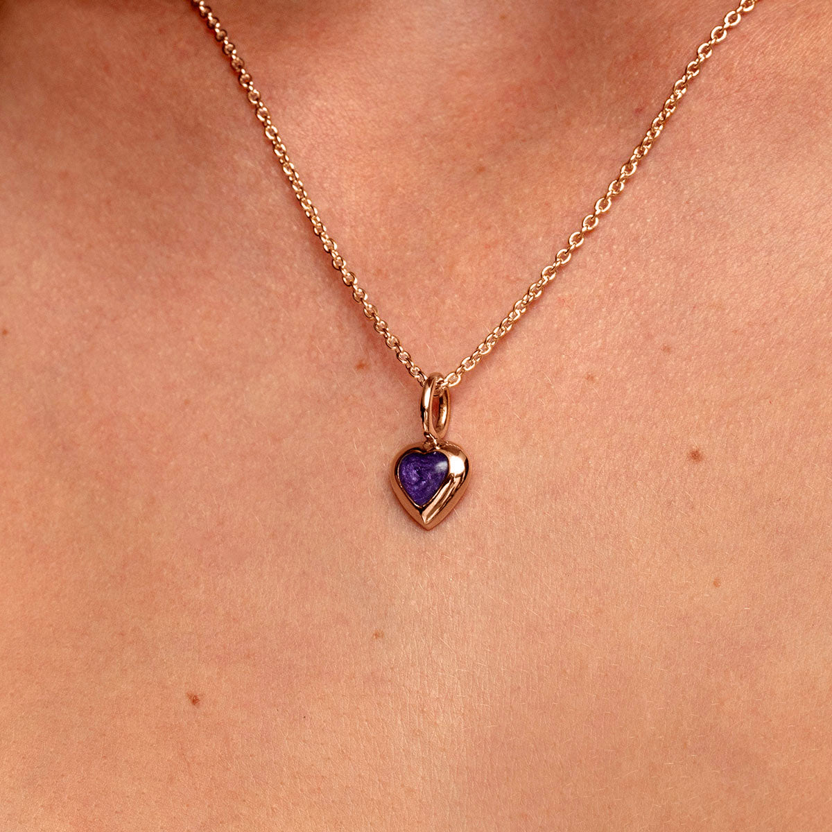 Crafted from 925 sterling silver plated with 18K rose gold this delicate piece features a heart shaped pendant with a signature loop bail.
