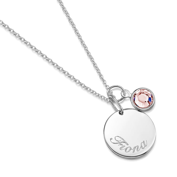 Crafted from 925 sterling silver, the smooth disc can be engraved with a name or date, creating a piece that marks a meaningful person or moment. The Swarovski® crystal birthstone adds a subtle pop of colour, representing a birth month or special connection.