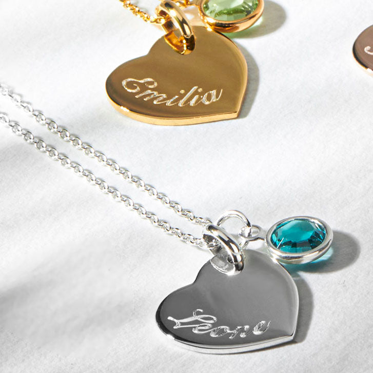 A classic heart pendant paired with a sparkling Swarovski® birthstone charm creates a necklace that is both personal and meaningful.