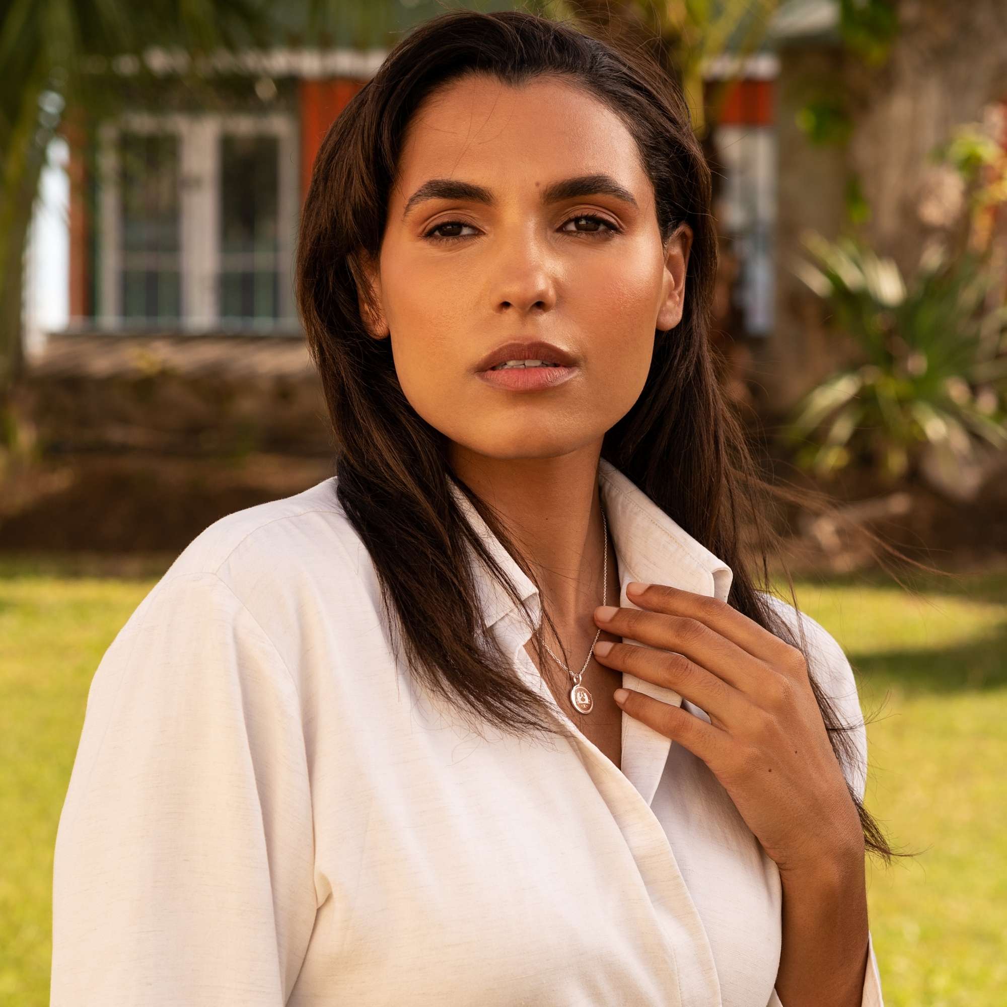 The pendant measures 15mm in diameter and is suspended from an adjustable 16–18 inch trace chain, with the option to upgrade to a longer 20-22-24 inch adjustable chain. The pendant and chain chain are crafted from 925 sterling silver.