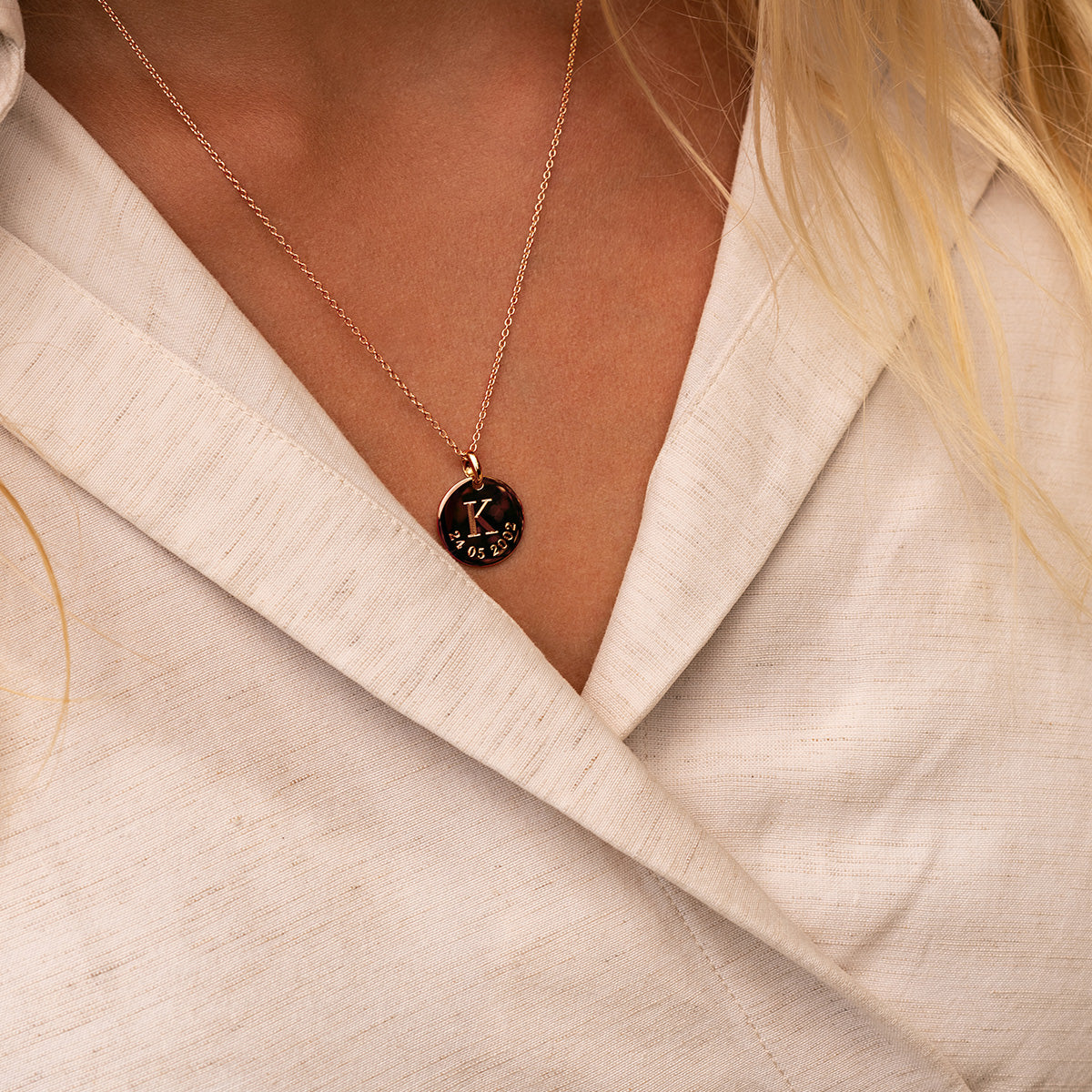 Crafted from 925 sterling silver plated with 18k rose gold, the front of the pendant showcases a single initial at the centre, with space to engrave a date around the edge - perfect for marking a birthday, anniversary, or special milestone. The simple circular form keeps the focus on the personal engraving while maintaining a refined, everyday style.