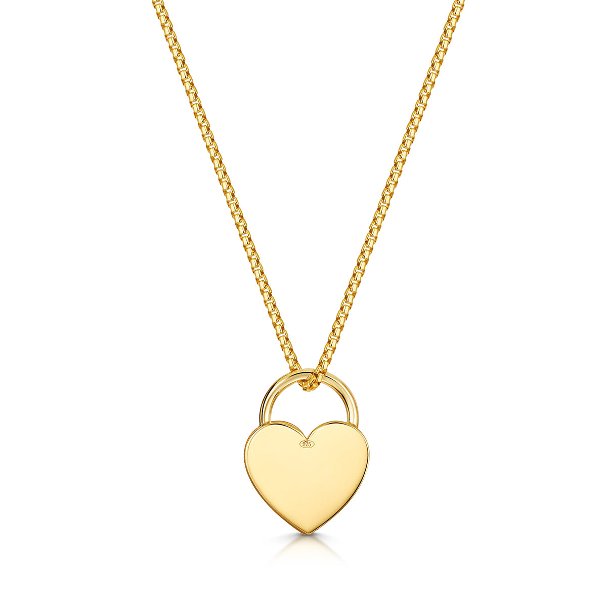 Crafted from 18K gold plate 925 sterling silver, the polished heart padlock pendant hangs from a trace chain and can be engraved with a name, date, or short message to make the piece uniquely yours.