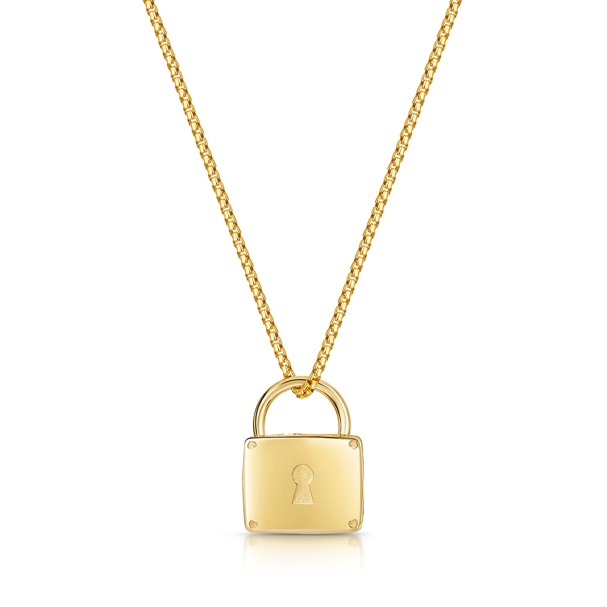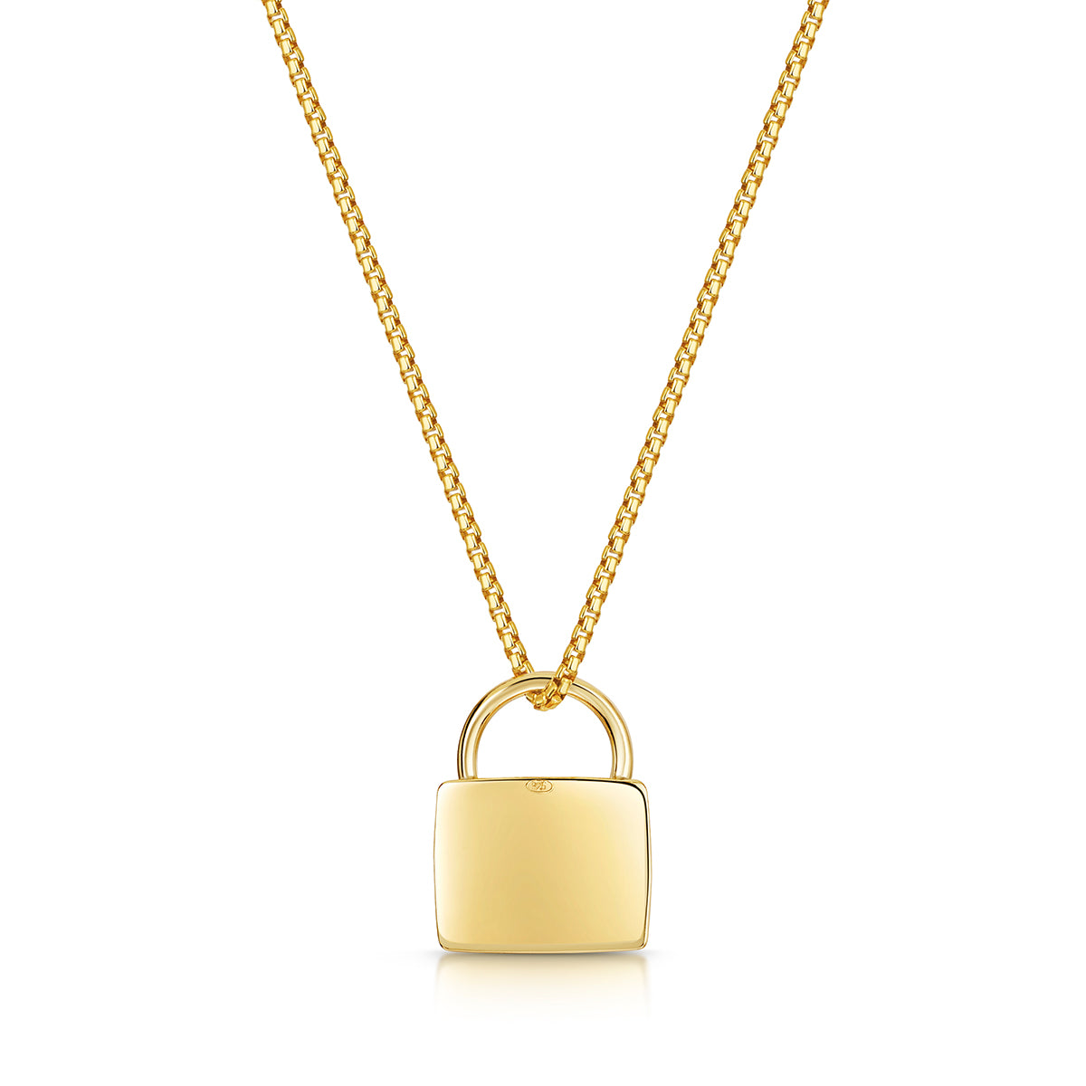 Crafted from 18K gold plate 925 sterling silver, the polished heart padlock pendant hangs from a trace chain and can be engraved with a name, date, or short message to make the piece uniquely yours.