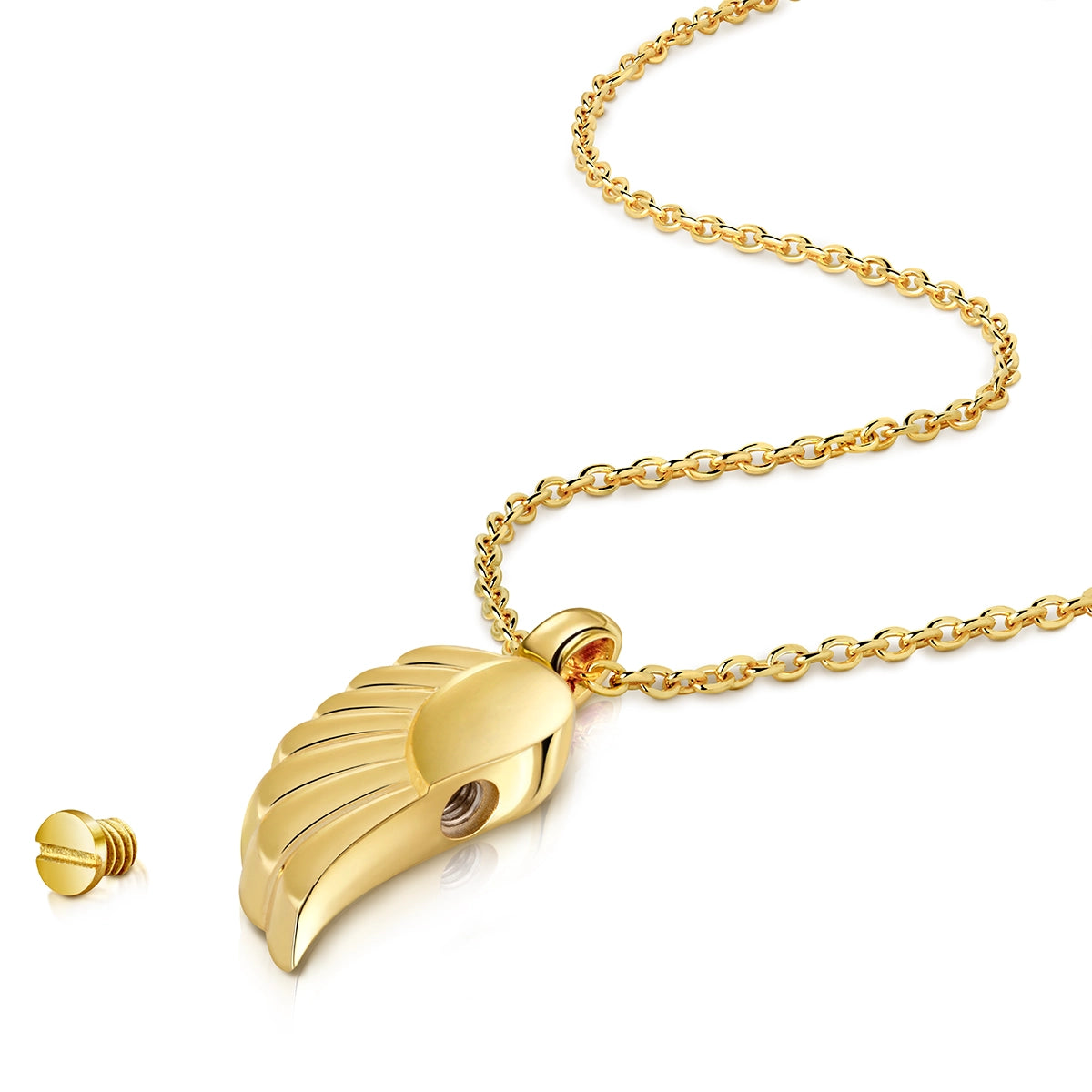 Pendant urn measures 24mm H x 11mm W x 5mm D, suspended from an adjustable trace chain made from 18k gold plated sterling silver.