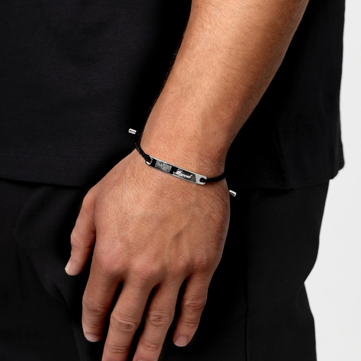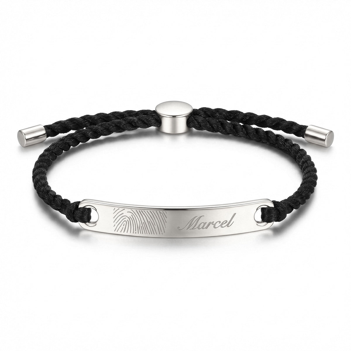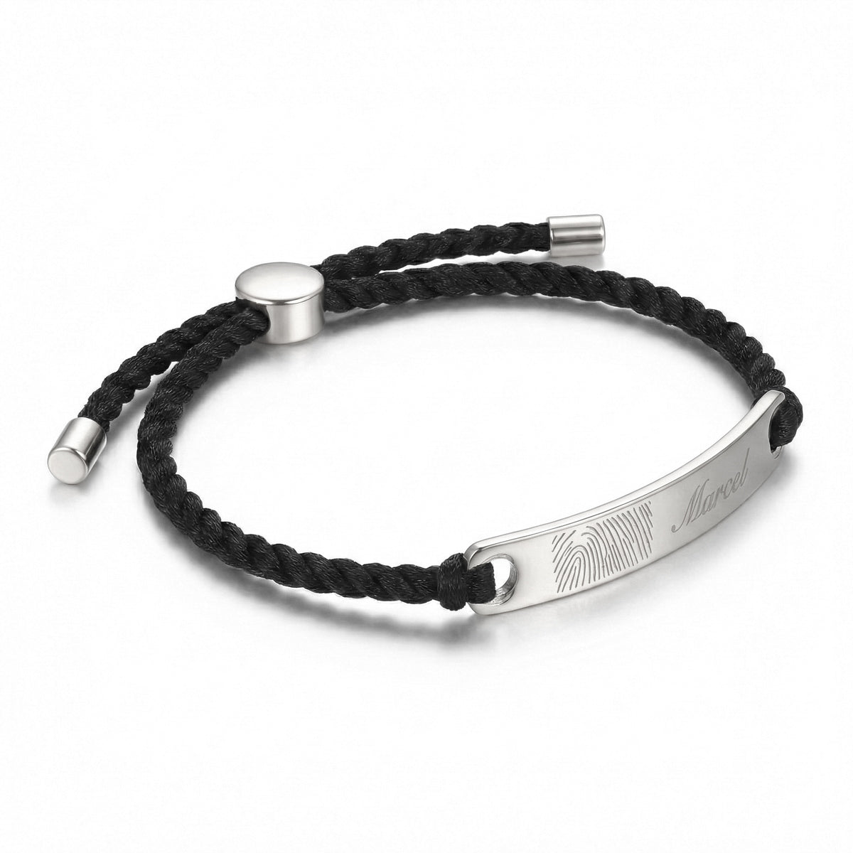 The top of the plate carries the fingerprint and can be engraved with initials, a name or date. The adjustable sliding clasp ensures a comfortable fit, while silver end caps finish the piece with a clean, modern look.