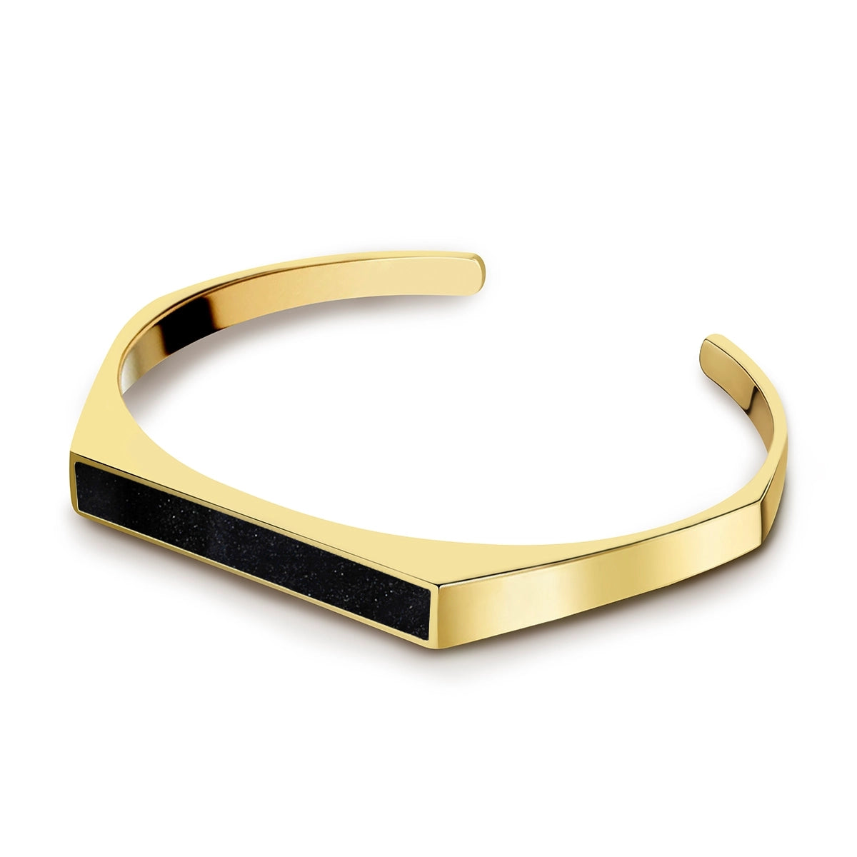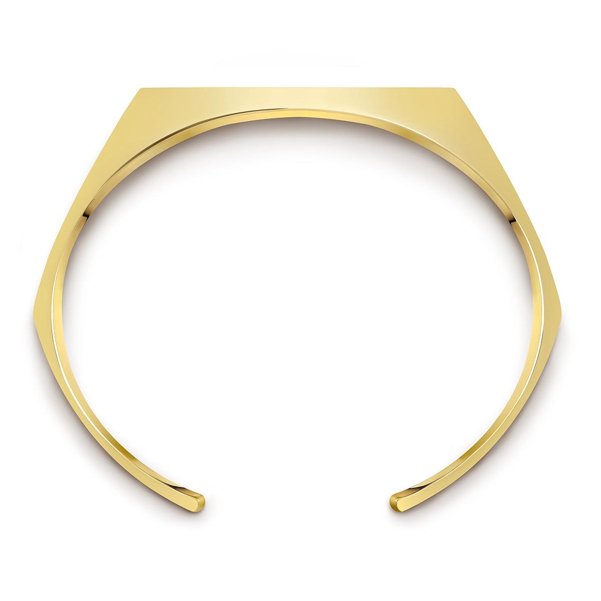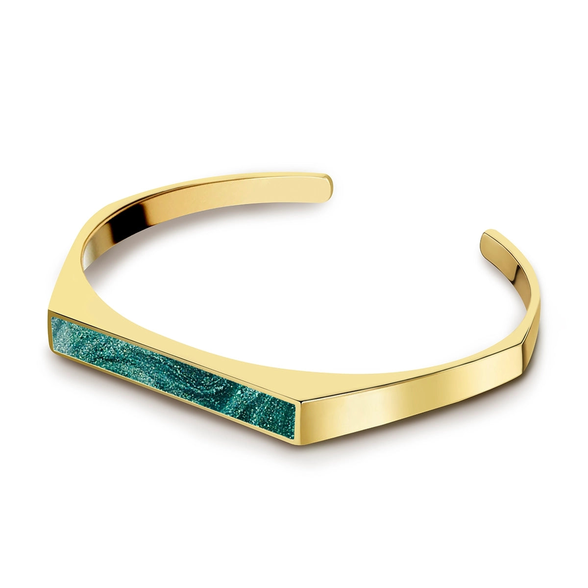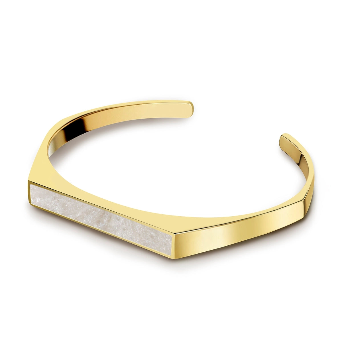 Crafted from solid 925 sterling silver and plated in 18k gold, this modern cuff bangle offers a bold yet understated tribute suitable for everyday wear.