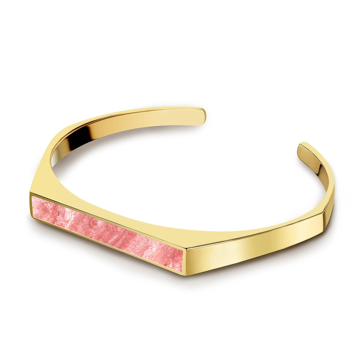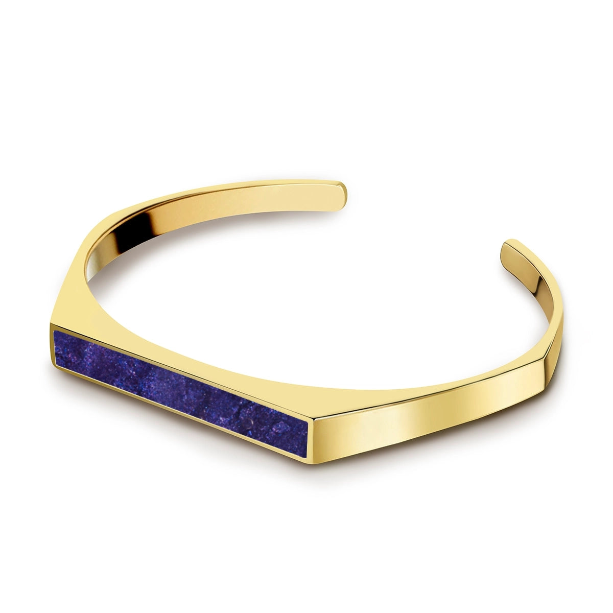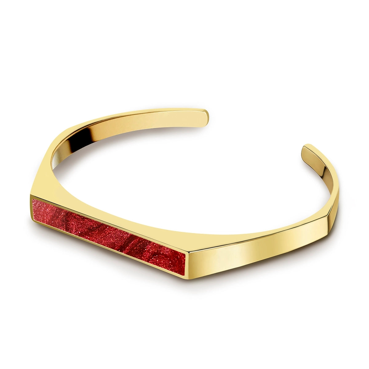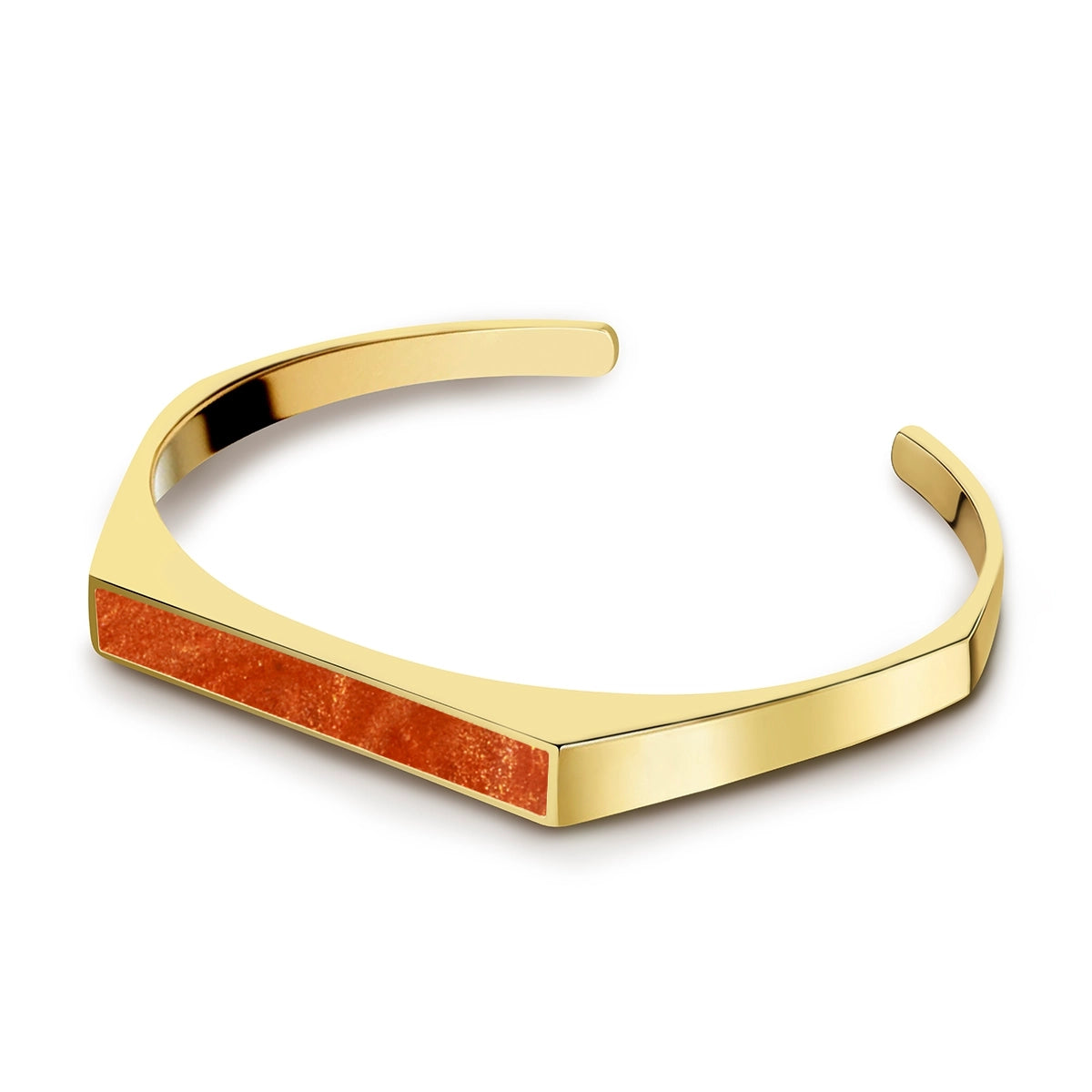 Crafted from solid 925 sterling silver and plated in 18k gold, this modern cuff bangle offers a bold yet understated tribute suitable for everyday wear.